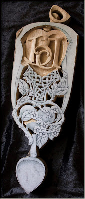 I have now continued with carving the front the celtic knot section and some more of the cherry branch above the cherry branch cage. I will have to decide on the thickness and three dimensional form of this section as I approach work on the back of the spoon.